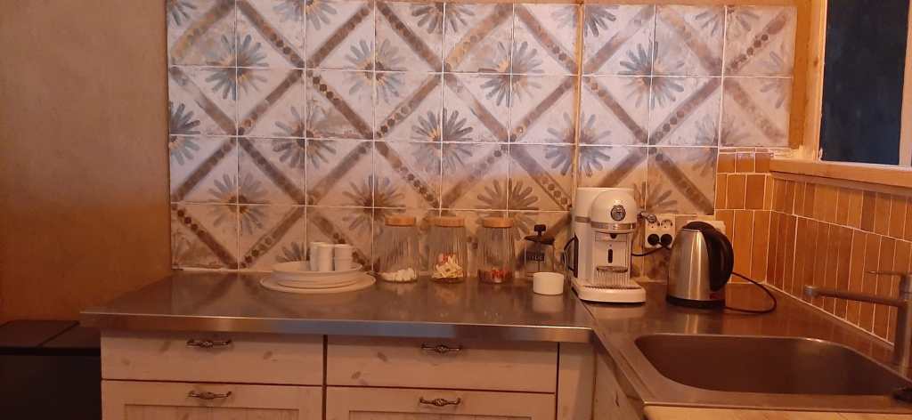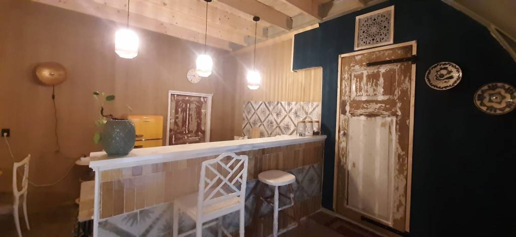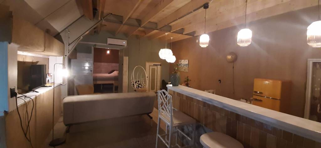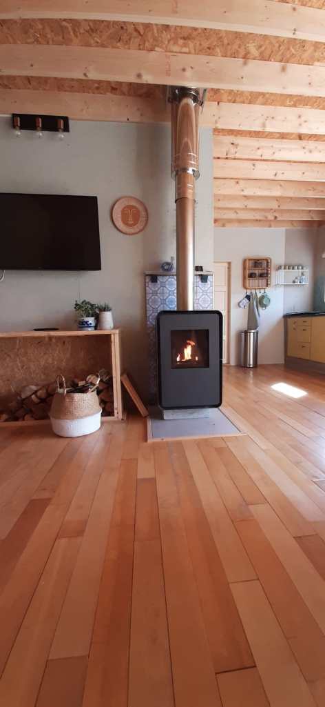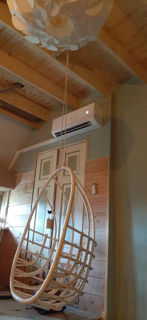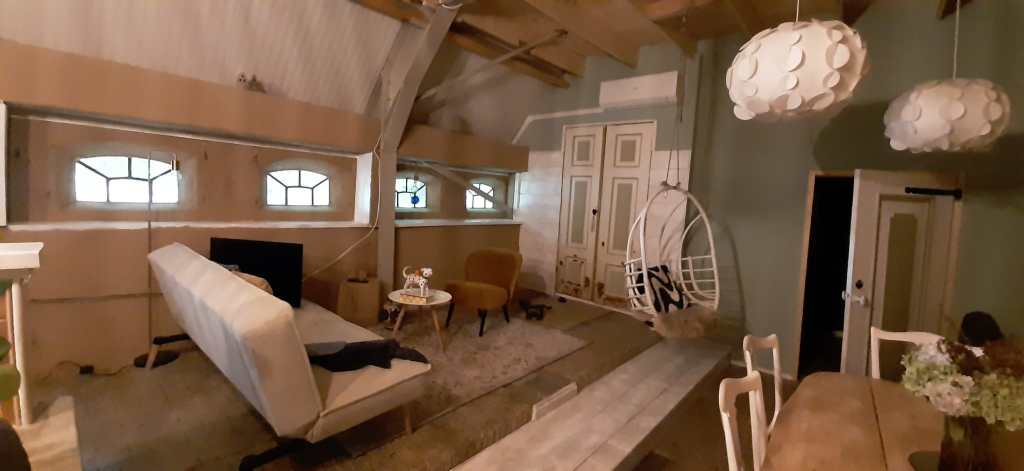 De muren zijn van leemstuc met stukjes stro erin. De vloer is origineel met echte Friese geeltjes. De ruimte wordt verwarmd middels een Airco-unit, tevens airconditioning. Er zit een volledig uitgeruste keuken in met een keramische kookplaat en een oven.