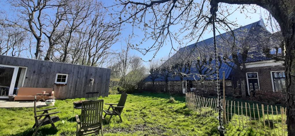 Je hebt je eigen ingang aan de rechterkant van de boerderij met een eigen terras en zithoek in het gras. Er is een gedeelde tuin met trampoline, schommel en klimtouw.